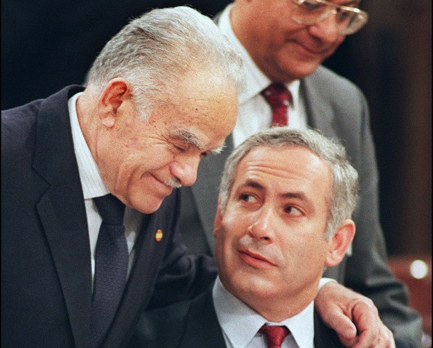 O irredutível primeiro-ministro Yitzhak Shamir, na inauguração da Conferência de Madrid, em 1991, com Benjamin Netanyahu, que era, na altura, o seu porta-voz