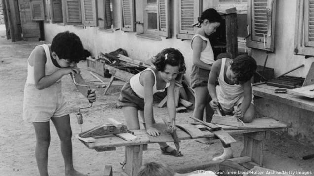 Crianças aprendem carpintaria no Kibbutz Givat Brenner, Israel, por volta de 1950