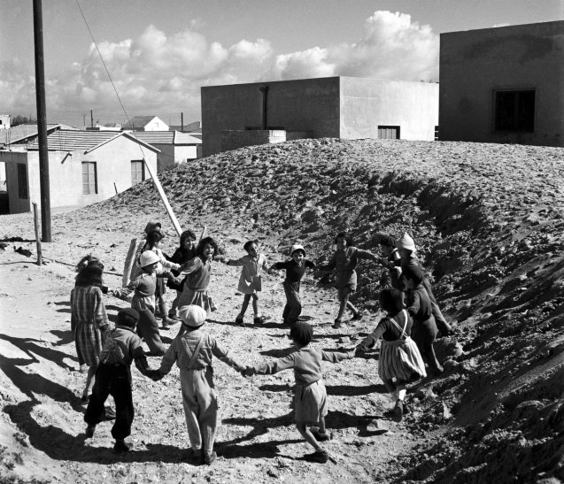 Crianças judias brincam no recém-construído Kibbutz Holon, perto de Telavive, em 1 de Julho de 1946, na Palestina do Mandato Britânico