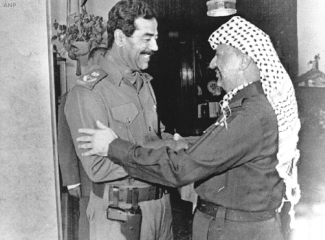Saddam Hussein, presidente do Iraque (e líder de uma facção rival do Partido Baas, em Bagdad), e Yasser Arafat, líder da OLP: os dois principais inimigos de Hafez al-Assad