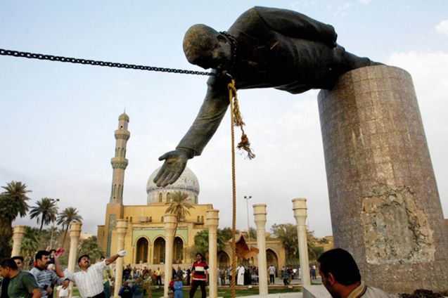 O esforço foi titânico mas, ao fim de várias horas, uma robusta estátua de Saddam Hussein, em Bagdad, ruiu [em 9 de Abril de 2003] aos pés de uma multidão em delírio. Com o tronco e os pés do tirno arrancados do pedestal, caiu também, simbolicamente, o regime que há um quarto de século governava o Iraque. (Ler mais | Read more...)