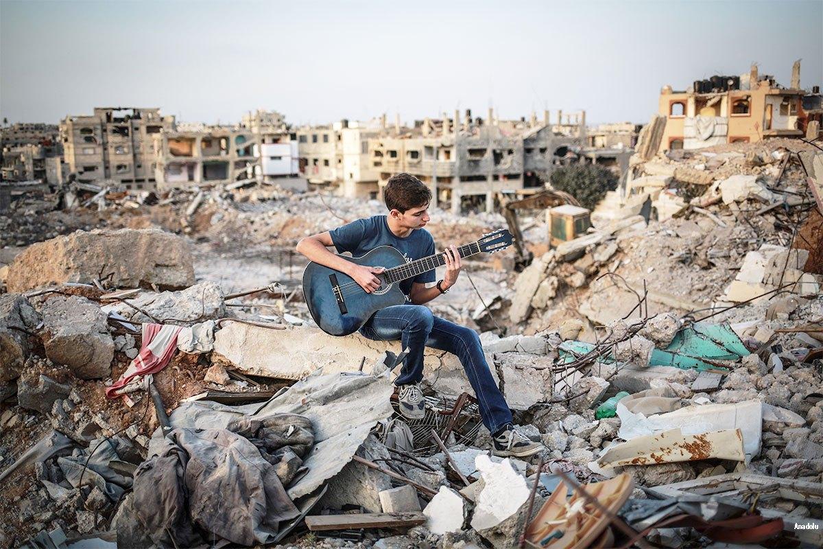Um jovem palestiniano toca guitarra nas ruínas da sua casa, destruída por Israel na Faixa de Gaza. Escreveu Avraham Burg: “Israel, que deixou de se preocupar com os filhos dos palestinianos, não deveria surpreender-se quando eles vêm banhados em ódio para se fazer explodir nos centros onde os israelitas fogem da realidade”