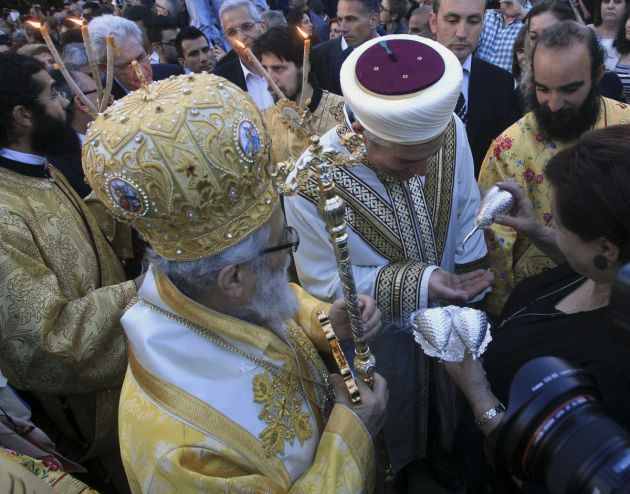 Um bispo ortodoxo grego e um imã muçulmano participam numa cerimónia de Sexta-Feira Santa, na Igreja de S. Jorge Exorinos, erguida no século XIV na cidade de Famagusta, no Norte de Chipre, em Abril de 2014. Centenas de peregrinos – alguns regressando à pátria após 40 anos de exílio forçado assistiram a esta liturgia