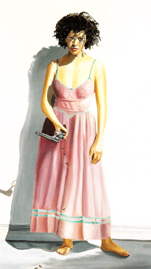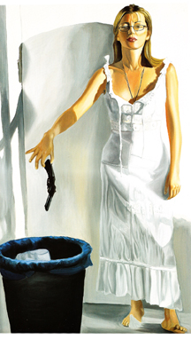 Para uma das suas mais importantes colecções, a óleo, Lia Voyatzi perguntou a várias pessoas conhecidas o que fariam com uma arma. A resposta está na pose que assumiram para os retratos que ela pintou. No primeiro quadro a ser vendido, um homem aponta um revólver à cabeça (na foto, a pintora e a pintura), numa tentativa de suicídio. Interpelada, a cliente justificou-se: “É assim que me sinto todos os dias de manhã”.