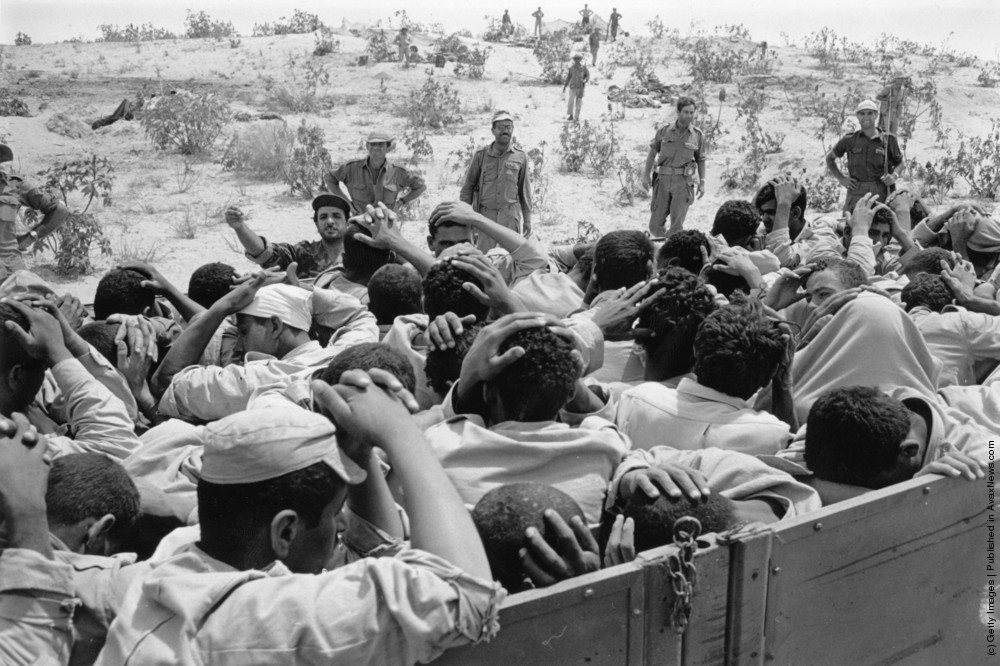 Prisioneiros de guerra egípcios no Sinai – uma das conquistas territoriais israelitas na “Guerra dos Seis Dias” em 1967. A península seria restituída em 1981, depois de um tratado de paz assinado entre o primeiro-ministro Menachem Begin e o Presidente Anwar el-Sadat (assassinado em 1981 por esta “traição”)