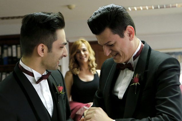 Marios Frixou (à dir.) e Fanos Eleftheriades sorriem durante a cerimónia do seu casamento na Câmara Municipal em Nicósia. Apesar de Chipre atrair muitas uniões civis, só em 2016 é que autorizou os primeiros casamentos gay