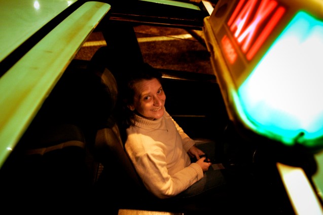 Vai carregando nos vários botões, um dos quais diz “homem morto”, que é um avisador de segurança e lhe “imobiliza o carro”, se algo corre mal. Toca frequentemente a buzina, para avisar peões distraídos e/ou automóveis atrevidos. E sorri sempre, radiosa no uniforme azul e amarelo, com brincos a condizer nas duas cores.