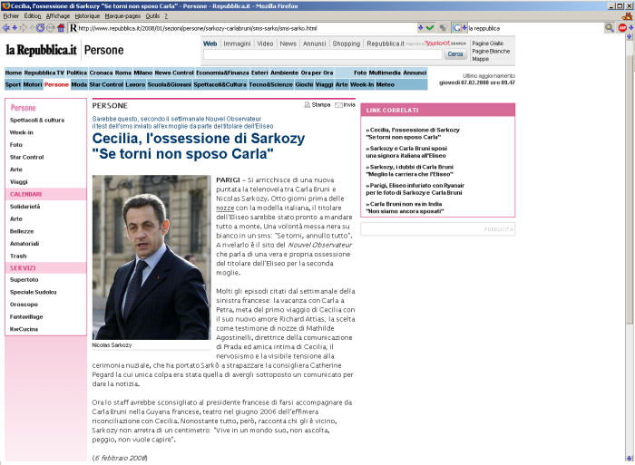 A 6 de Março [de 2008], o site nouvelobs.com noticiou que, oito dias antes de se casar com Carla Bruni, o Presidente Nicolas Sarkozy enviou um SMS à sua ex-mulher Cécilia Ciganer-Alberniz, dizendo-lhe, alegadamente, “se voltares, cancelo tudo.”