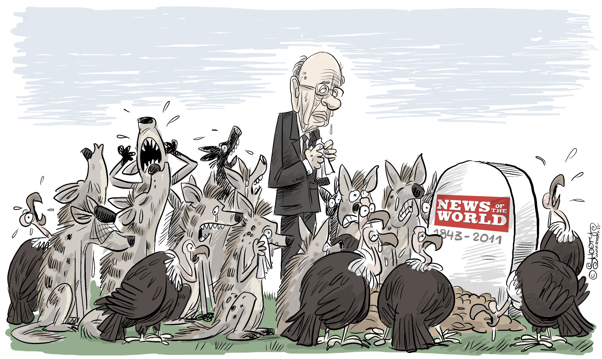 Em 2011, depois de mais um escândalo, envolvendo escutas telefónicas, o magnata Rupert Murdoch (nesta ilustração) encerrou o seu tablóide News of the World, fundado 168 anos antes