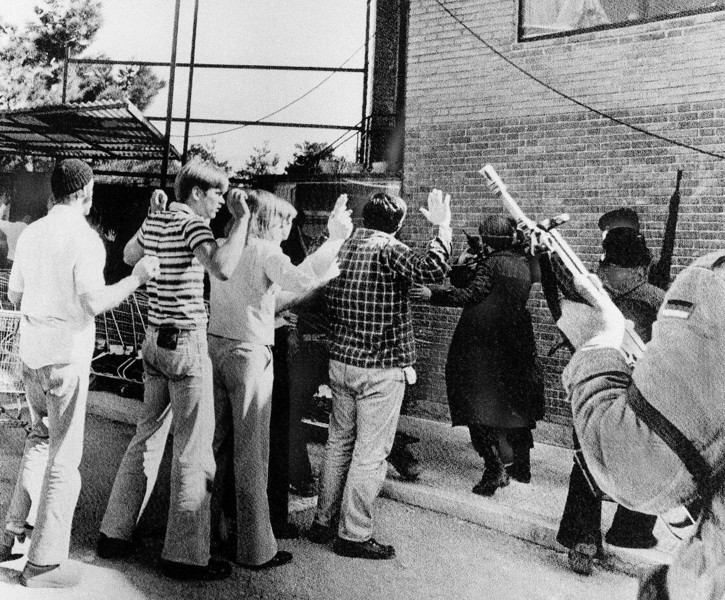 Iranianos armados revistam funcionários da Embaixada dos Estados Unidos em Teerão, depois de ocuparem a missão diplomática, em 14 de Fevereiro de 1979. O cerco durou 444 dias e envenenou até agora os laços entre os dois países