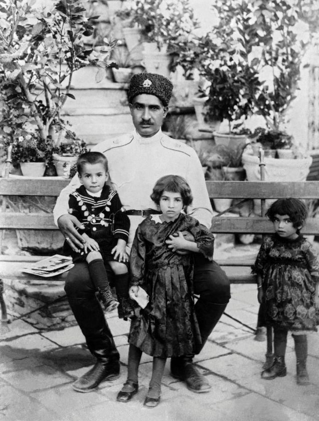 Reza Khan (ao centro), o primeiro Xá da dinastia Pahlavi, com os seus dois filhos gémeos: Mohammad (o sucessor) e a princesa Ashraf