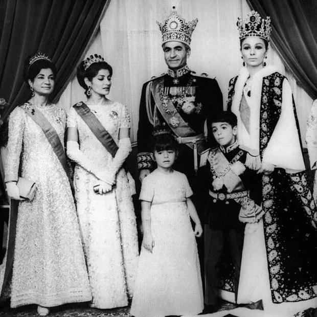 A família Pahlavi em Outubro de 1967, quando Mohammad Reza deu a si próprio o título de Shahansh (Imperador), numa extravagante cerimónia em Teerão. Da esq. para a dir.: as princesas Ashraf e Shahnaz, o monarca e Farah Diba; em baixo: a princesa Farahnaz e o príncipe herdeiro Reza Pahlavi