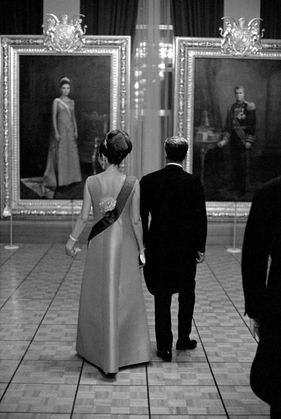 Yves Saint-Laurent, da casa Dior, desenhou-lhe o vestido bordado com fios de prata. As irmãs Carita inventaram para ela o penteado com o risco ao meio e as têmporas cobertas que se tornaria moda no mundo inteiro. O diadema para a cabeça era jóia do Estado. Concebido nos anos 50 pelo americano Harry Winston, pesava dois quilos.