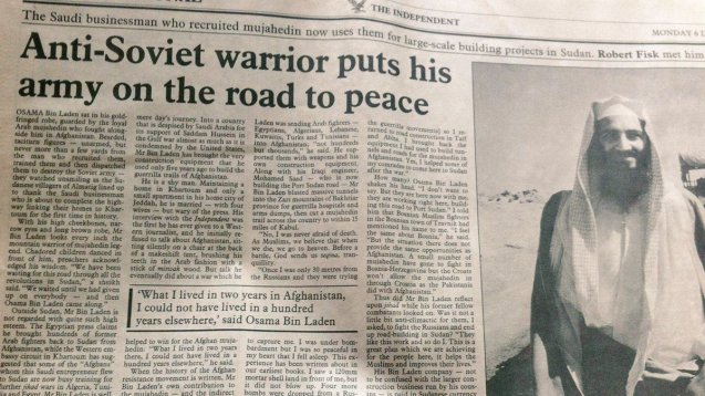 Dos primeiros jornalistas a encontrar-se com Osama Bin Laden, que o qualificou de “repórter neutral”, Fisk desabafa o desgosto: “Vai ser como um albatroz que me perseguirá o resto da minha vida.. (…) Ele criou a al-Qaeda para ele – não para nós. Foi um sucesso pessoal. Ela existe. Podemos compará-la à criação da bomba atómica” (Na foto, o artigo que “Mr Robert” publicou no diário britânico ‘The Independent ‘depois de falar com o chefe da Al-Qaeda, em 1993)