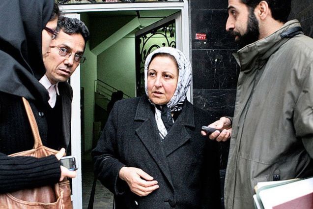 Shirin Ebadi (centro) em 21 de Dezembro de 2008, à saída do Centro de Protecção dos Direitos Humanos no Irão, depois de a polícia ter efectuado uma rusga e encerrado as instalações