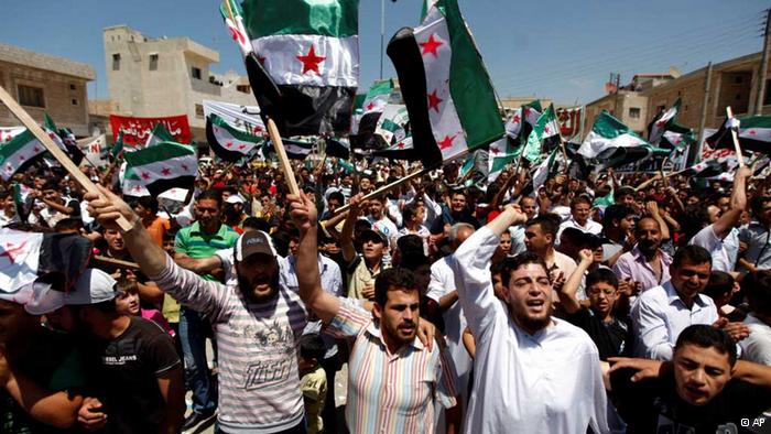 Daraa, onde começou a rebelião popular, inicialmente pacífica, visando forçar reformas políticas. O regime respondeu com força bruta e não demorou até que a revolta se transformasse em guerra civil. Nesta foto, de 23 de Março de 2011, activistas concentram-se nas ruas da cidade para protestar contra um ataque de forças leais ao presidente contra um grupo que protegia uma mesquita local