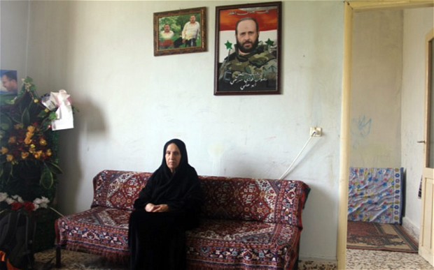 Fatima Merhi, mãe xiita síria de 77 anos, deixa-se fotografar no seu refúgio no Líbano, junto de um quadro com a imagem do filho Radwan, um elemento das forças rebeldes morto em Damasco, em Maio de 2013