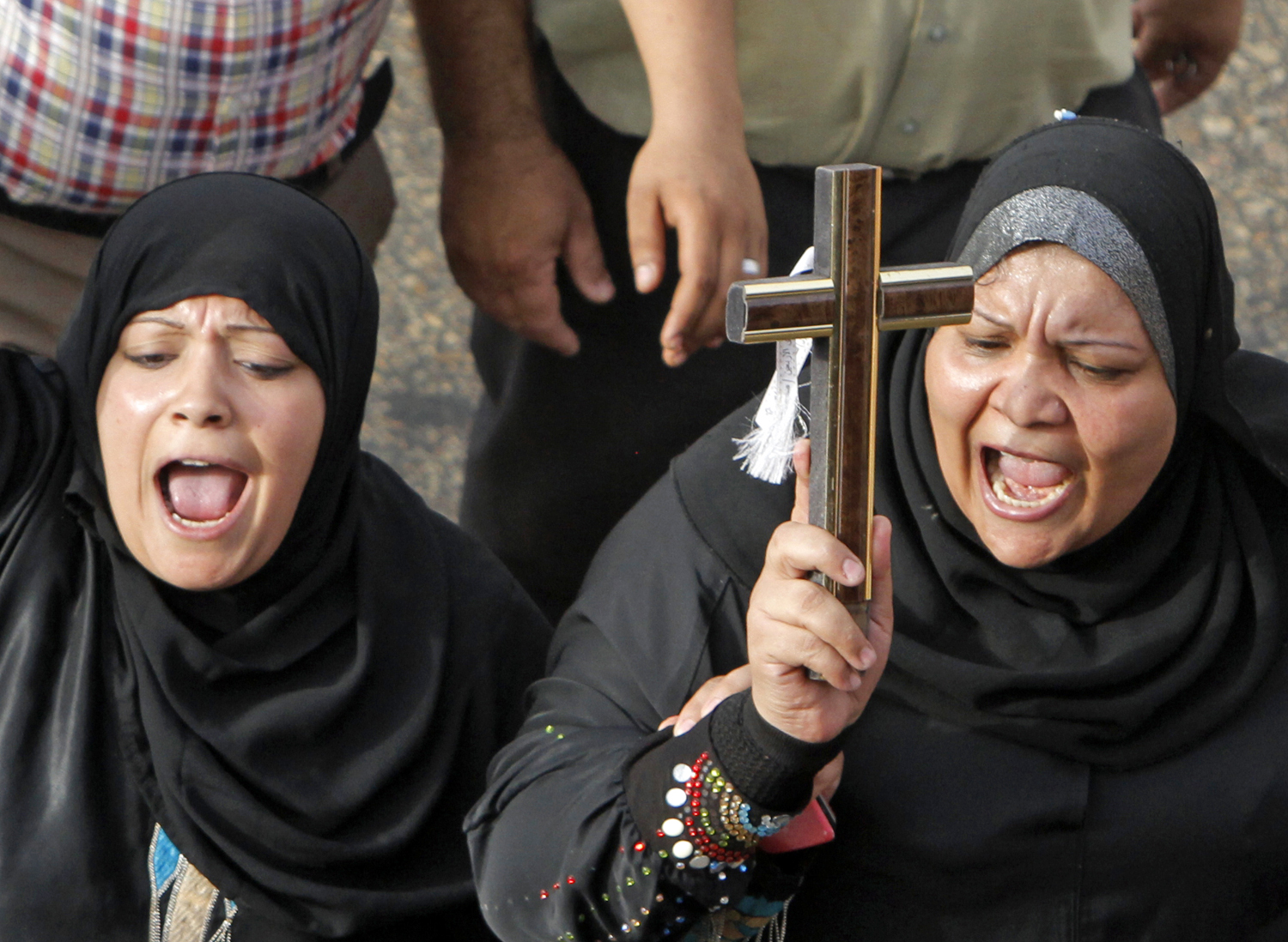 Egípcias muçulmanas erguem crucifixos durante uma manifestação no Cairo de protesto contra ataques de que resultaram vários mortos na comunidade copta, em Abril de 2013