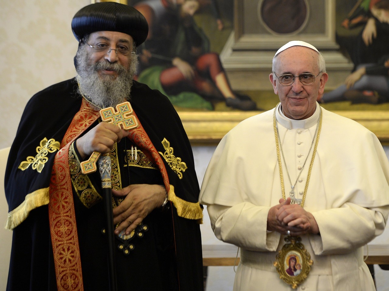 O sucessor de Shenouda III como líder espiritual dos coptas ortodoxos, Papa Tawadros II (esq.) e o chefe da Igreja Católica Romana, Papa Francisco, durante uma audiência privada, no Vaticano, em 10 de Maio de 2013
