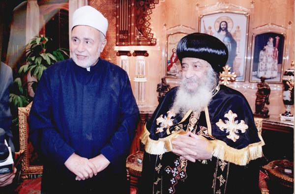 Shenouda III com o Xeque Muhammad Sayyid Tantawi (esq.), grande Mufti e Imã da Mesquita de Al-Azhar que morreria, na Arábia Saudita, em 10 de Março de 2010