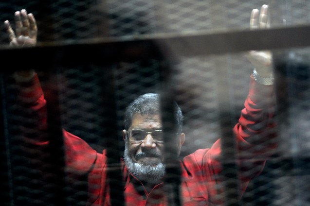 Mohamed Morsi envergando o fato vermelho dos prisioneiros condenados à morte, na “gaiola” dos réus, durante uma das primeiras audiências depois do golpe militar que o derrubou
