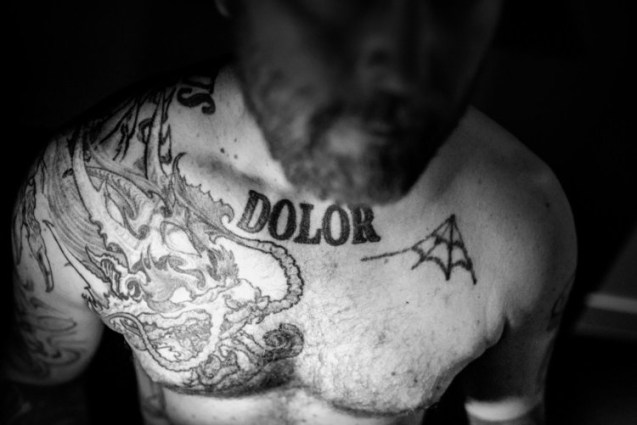 Das múltiplas tatuagens que Arno Michaelis ostenta, há uma que se destaca. No pescoço gravou a palavra Dolor.