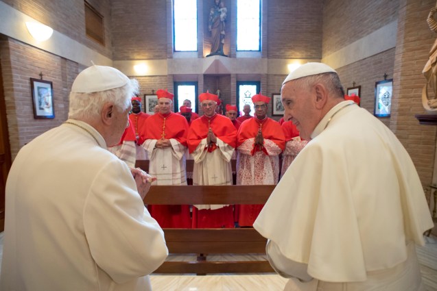 Em 2 de Maio de 2013, pela primeira vez desde que abdicou, alegando “forte cansaço”, o agora Papa emérito Bento XVI deixou a sua residência de Verão, em Castel Gandolfo, 25 quilómetros de Roma, e regressou ao Vaticano. Aqui, onde chegou de helicóptero, ficará a residir, a poucos metros do seu sucessor, o Papa Francisco (Na foto, o actual e o anterior pontífices encontram-se com um grupo de cardeais, em 19 de Novembro de 2016)