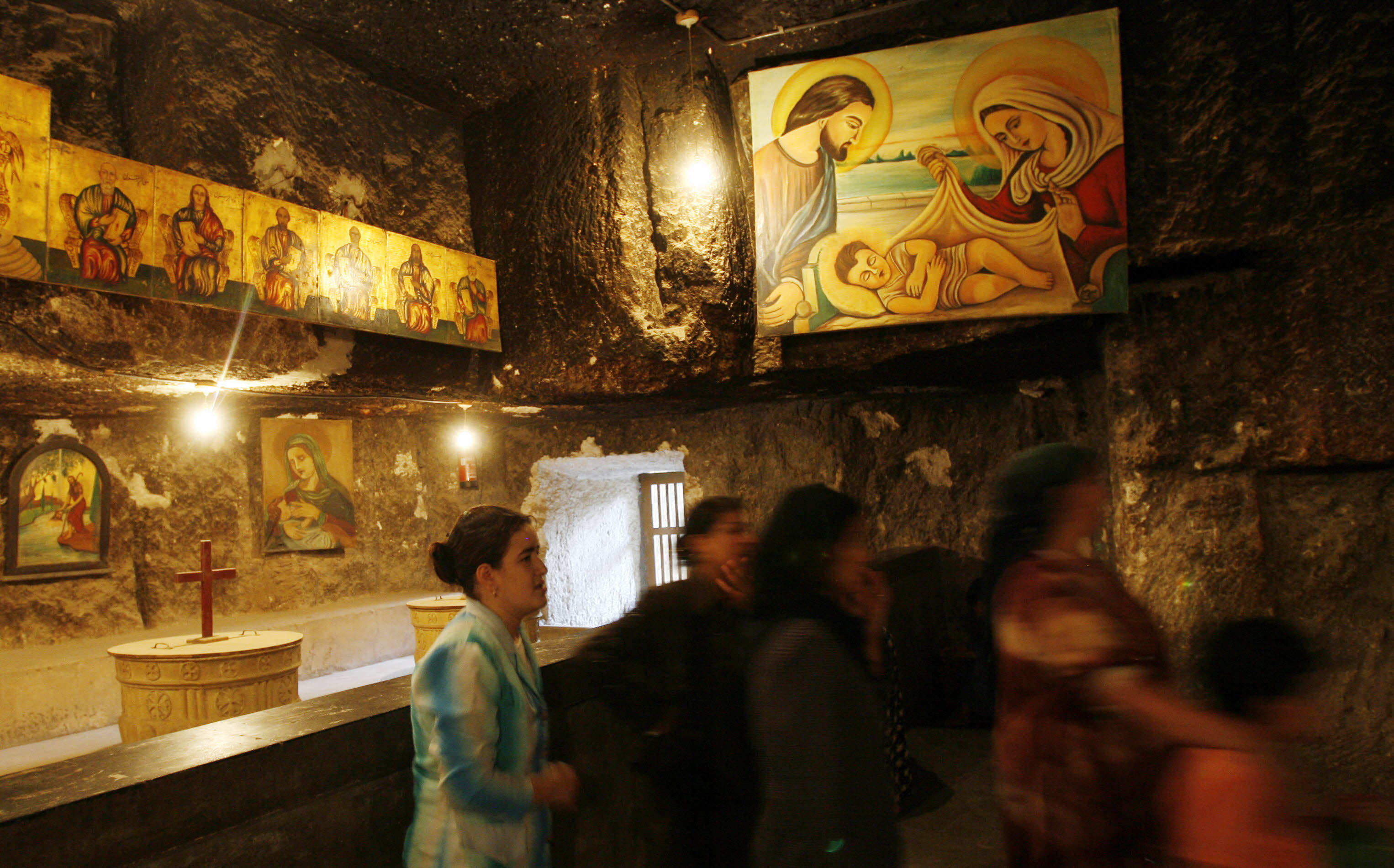 Fiéis escutam o sermão de um padre copta, em 26 de Julho de 2012, na igreja de São Samaans (Simão), conhecida como igreja da Gruta, na aldeia de Mokattam, no Cairo. Uma vez por semana, os cristãos egípcios reúnem-se aqui, depois das orações, para serviços de exorcismo ou benção dos doentes. O Mosteiro de São Simão é o maior no Médio Oriente, com um anfiteatro capaz de acolher cerca de 20 mil pessoas. Simão viveu no final do século X, quando o Egipto era governado pelo califa muçulmano da dinastia fatimita (xiita) Al-Muizz Lideenillah