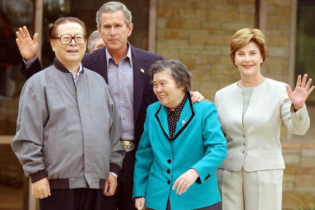 Wang Yeping viajou para o estrangeiro algumas vezes com o marido, o presidente Jiang Zemin, mas era descrita como “acompanhante silenciosa e invisível” (Na foto, o casal presidencial chinês com George W. e Lara Bush)