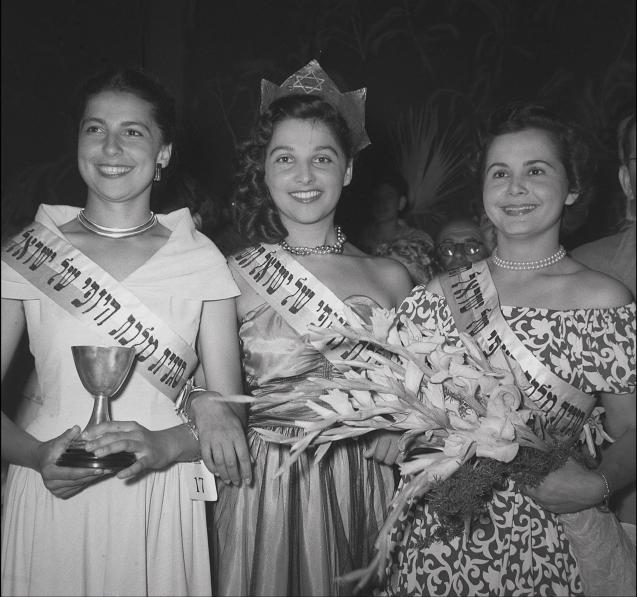 Primeira Miss Israel, em 1950: Miriam Yaron (ao centro, ladeada pelas suas damas de honor). De origem alemã, chamava-se antes Giselle Freilich