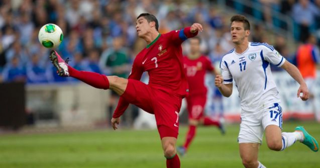 Cristiano Ronaldo disputa a bola ao israelita Rami Gershom num jogo de qualificação para o Campeonato do Mundo, em 22 de Março de 2013, no estádio nacional de Ramat Gan. O resultado foi um empate