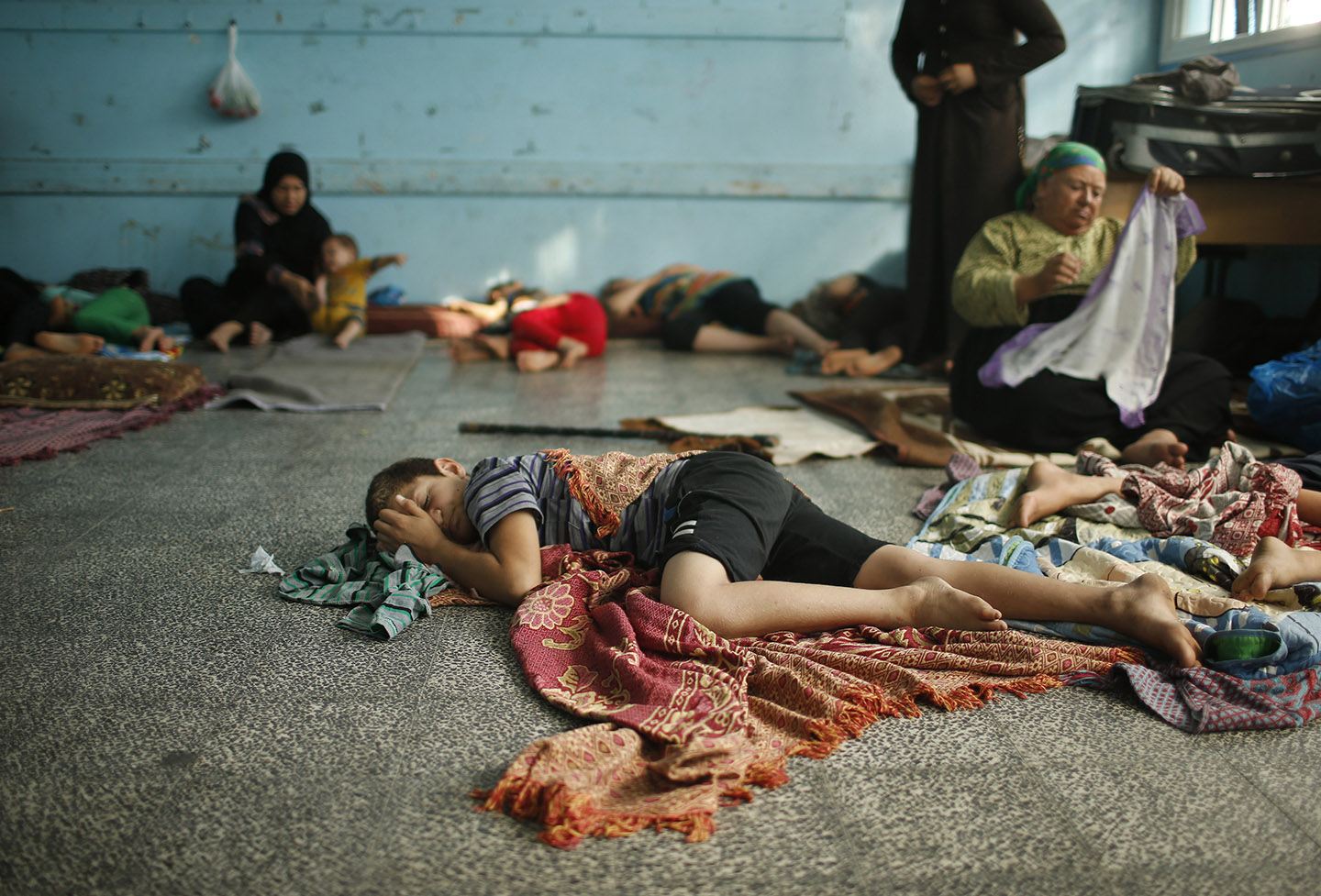 Um rapaz que fugiu da casa da família destruída na aldeia de Beit Lahiya, na fronteira com Israel, dorme numa escola gerida pela UNRWA, agência das Nações Unidas de apoio aos refugiados palestinianos, onde muitos outros civis se abrigaram, em 14 de Julho de 2014