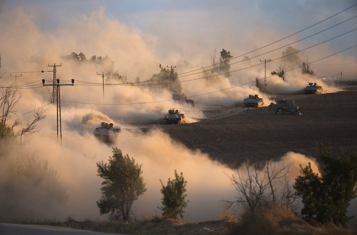 Soldados da Brigada de Infantaria Nahal, uma das unidades de elite do exército israelita, na região central da Faixa de Gaza, durante a invasão terrestre