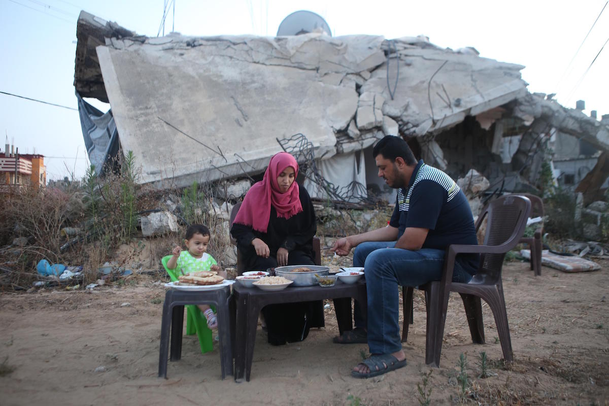 A família Shaheen partilha uma refeição junto aos destroços da sua casa destruída durante a ofensiva militar israelita na Faixa de Gaza em 2014 – ainda não a conseguiram reconstruir