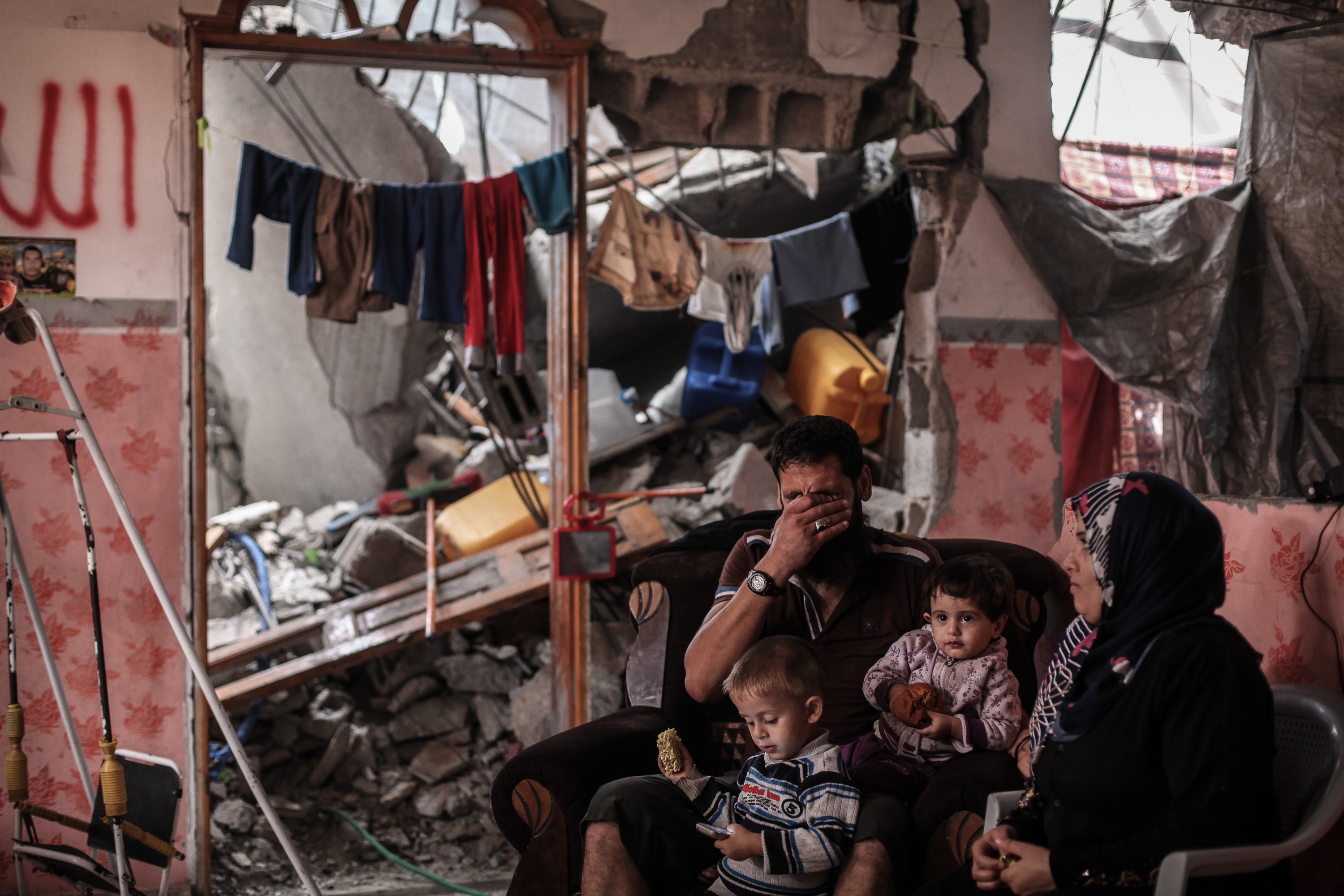 Madi Hasanein e a sua familia, no que resta da sua casa, no bairro de Tofah, na Cidade de Gaza, em Outubro de 2014