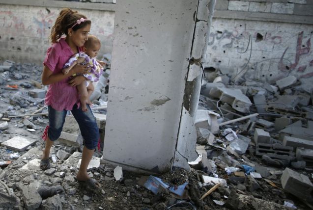 Uma criança sentada nas ruínas da sua casa arrasada pela aviação israelita em Beit Hanoun, um bairro da Faixa de Gaza, em 12 Agosto de 2014