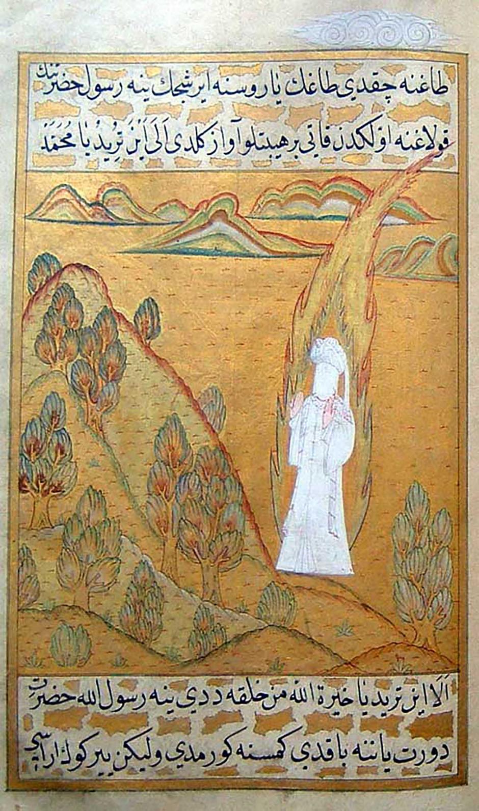 The Prophet Muhammad receives revelations at Mount Hira, al-Darir, Siyer-i Nebi (The Biography of the Prophet), Istanbul, Ottoman lands, 1595-1596