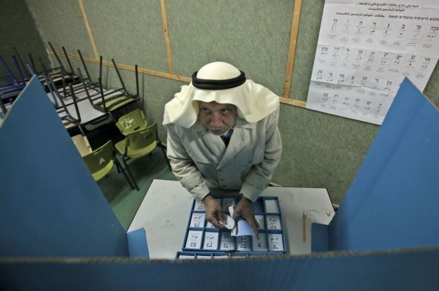 Abdullah Talash, 74 anos, palestiniano de cidadania israelita escolhe um boletim de voto numa assembleia a aldeia de Umm Al-Fahm, no norte de Israel