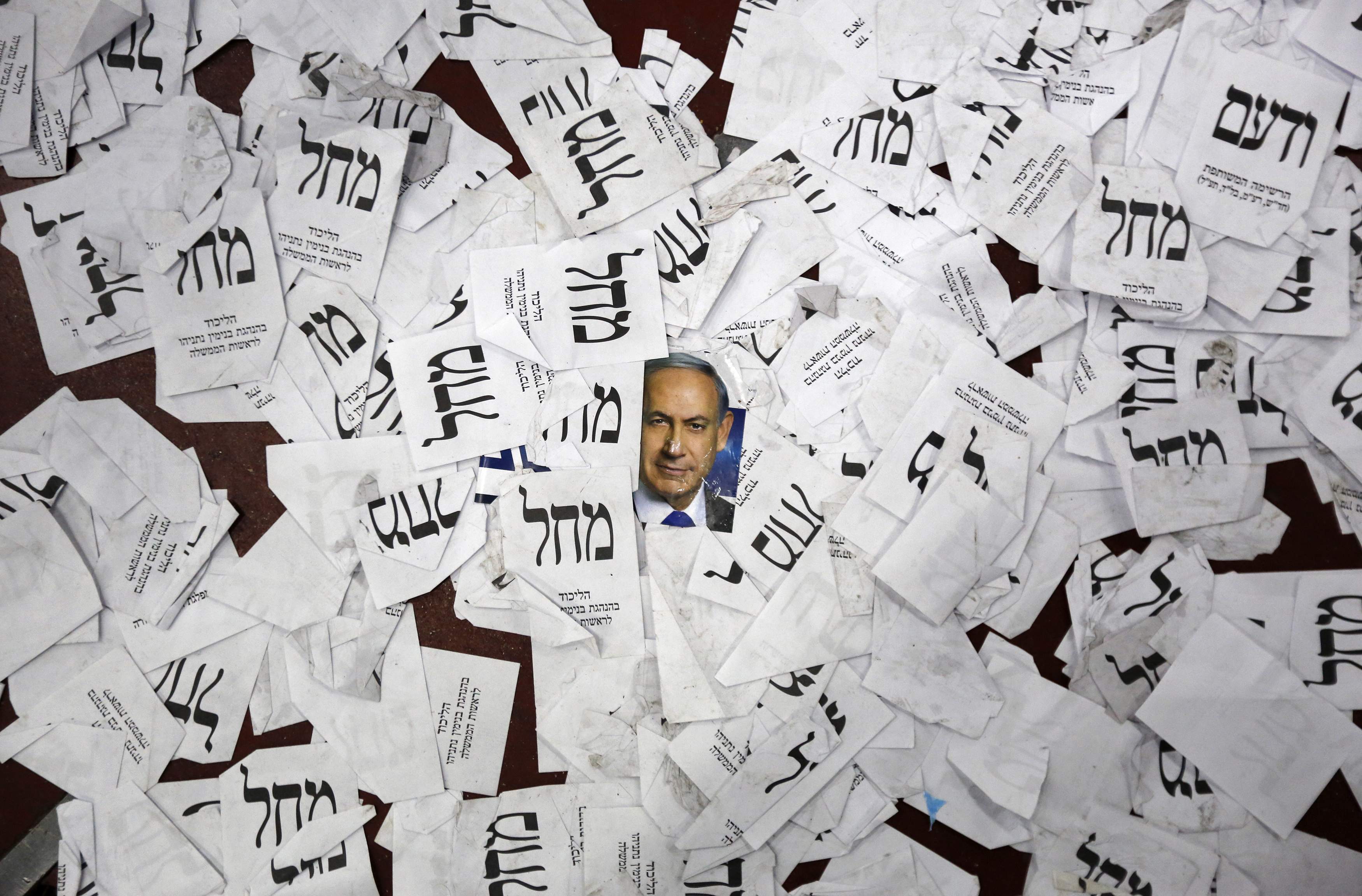 Uma foto de Benjamin Netanyahu misturada com panfletos eleitorais no chão da sede do Likud , em Telavive, depois da festa da vitória do partido, em18 de Março de 2015