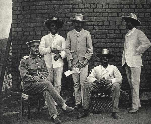 O alemão Theodor Leutwein (esq.), com os líderes dos Herero Zacharias Zeraua (segundo a partir da esq.) e Manasseh Tyiseseta (sentado, o quarto a partir da esq.) em 1895