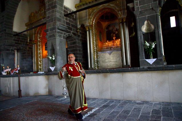 An Armenian deacon carries an incense burner during Easter mass at St. Giragos Church in Diyarbakir, in southeastern Turkey. Some Armenians who survived a slaughter at the hands of the Ottomans a century ago were raised by Muslim families. Some descendants of those ‘hidden Armenians’ are now reclaiming their heritage