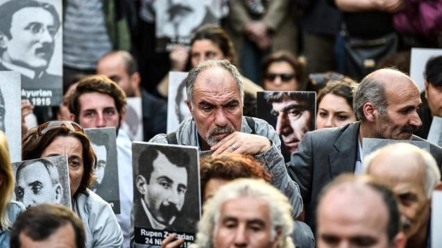 People hold up portraits of Armenian intellectuals at a rally in Istanbul to commemorate the Armenian massacre of 1915