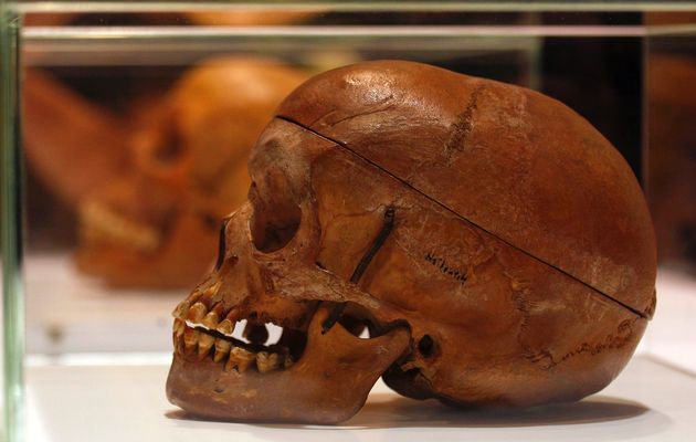 “Herero women incarcerated in concentration camps in what was then German South-West Africa were given a terrible task: they were ordered to remove the flesh from the skulls of their dead menfolk. The skulls were stripped of soft tissue using boiling water and glass shards. They were then shipped to Germany for scientists to test the racial theories that were popular at the time. German troops had captured primarily members of the Herero ethnic group, but also some of the Nama. In this pictures, a human Herero skull displayed at Berlin’s Charite hospital”