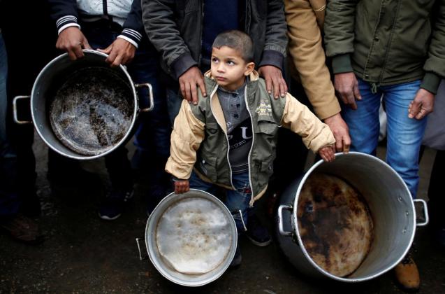 Crianças do campo de refugiados palestiniano de Yarmouk recolhem ajuda alimentar no bairro adjacente de Jazira, em Fevereiro de 2015