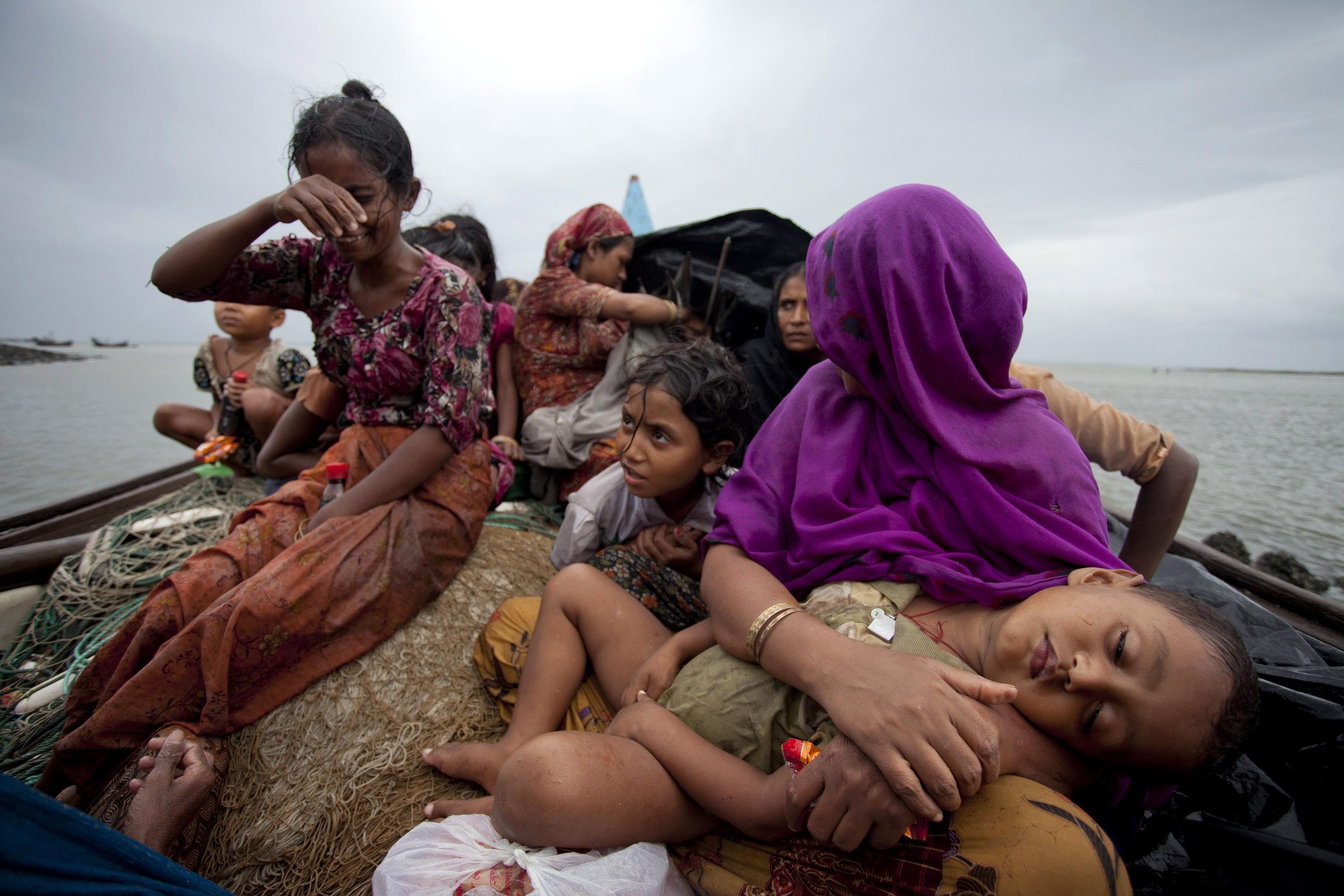 Rohingya Muslim women and children sit in a boat after they were intercepted by Bangladesh Border Guard (BGB) members in Teknaf, on 13 June, 2012. Thousands of refugees hav been trying to escape sectarian violence in Myanmar’s western Rakhine state