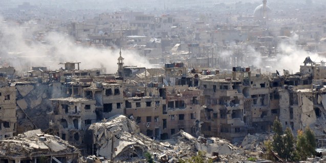 A picture taken on April 21, 2018, shows smoke billowing from the Palestinian refugee camp of Yarmouk during regime strikes targeting the Islamic State group in the camp