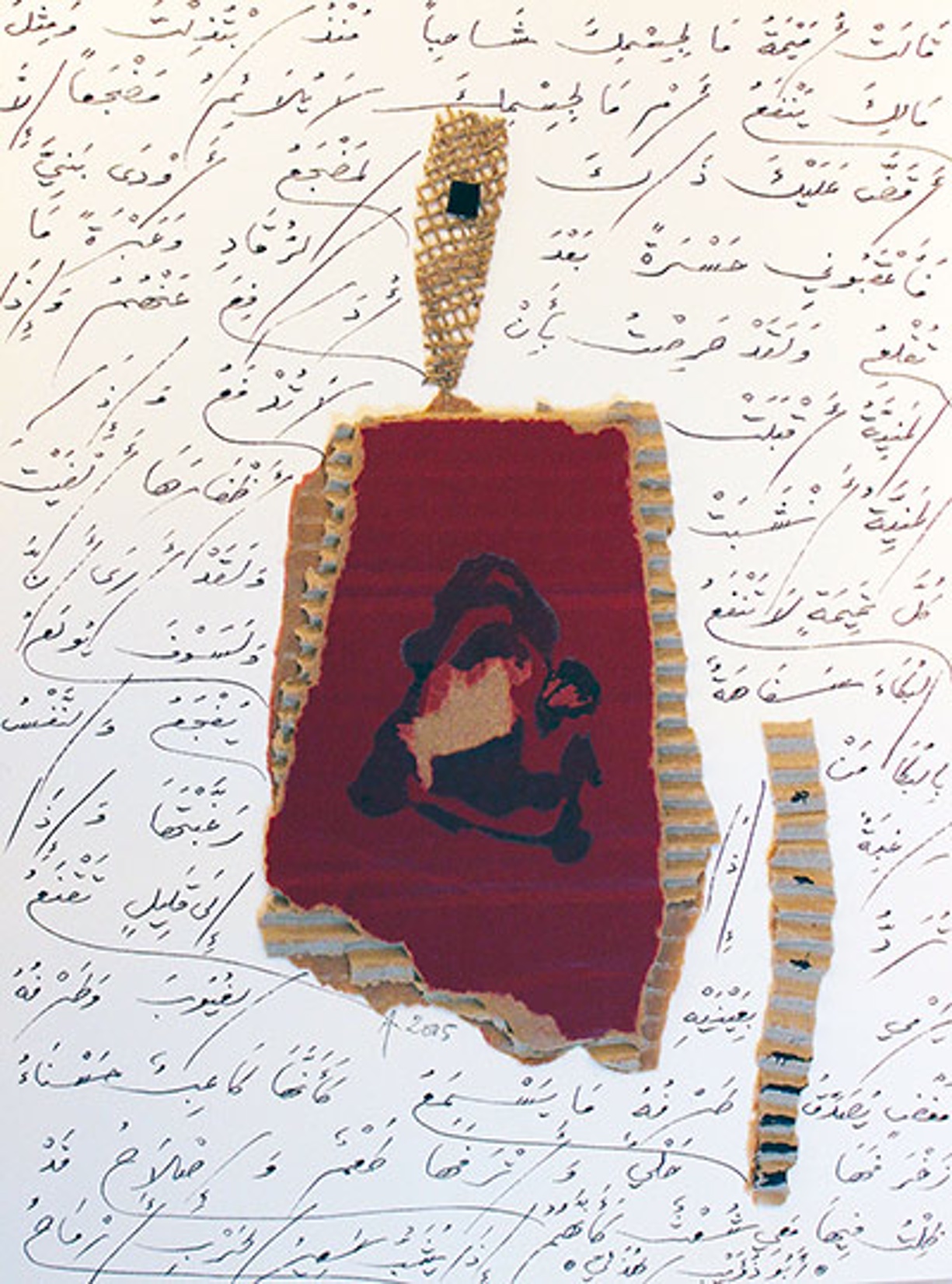 Untitled 2005: “The text is from a pre-Islamic poet, Abu Zu’aib Al-Huzali which speaks of his life and loves. The cardboard comes from a torn-up box of books”