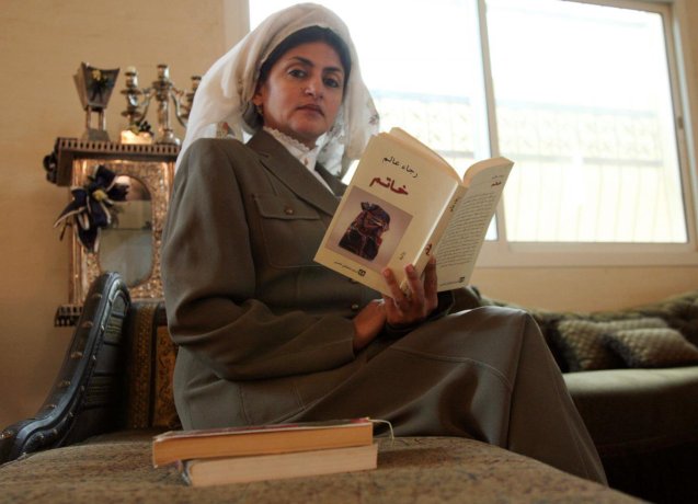 Hatoon al-Fassi, author of Women in Pre-Islamic Arabia: Nabataea, stands with her book at her residence, in Riyadh