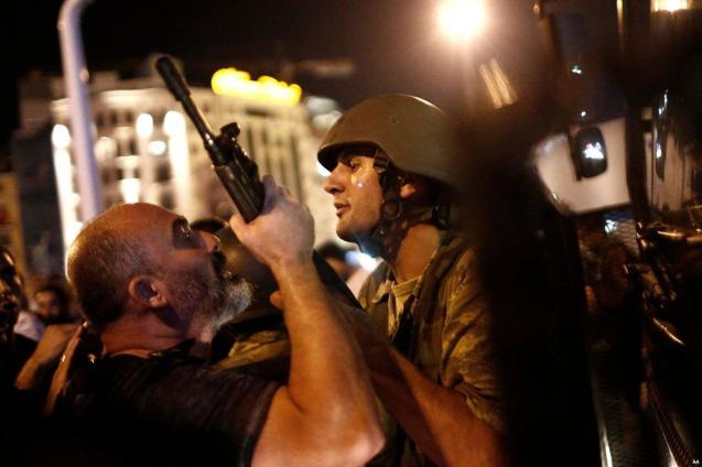 Confronto entre um soldado e um oficial da Polícia na Praça de Taksim, em Istambul: as forças de segurança dividiram-se na lealdade a Erdogan