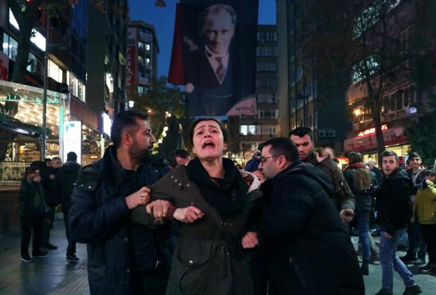 Novembro 2017: Polícias turcos detêm uma manifestante que protestava em Istambul contra a vaga de prisões que se seguiu ao golpe